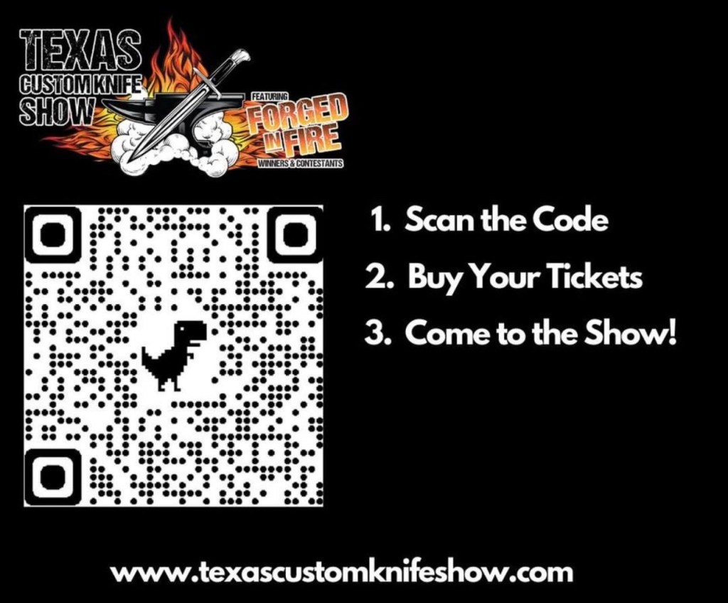 AS A REMINDER: Nest weekend is the Texas Custom Knife Show. You can use the scan code to get your tickets ahead of time. Hope to see you there!
